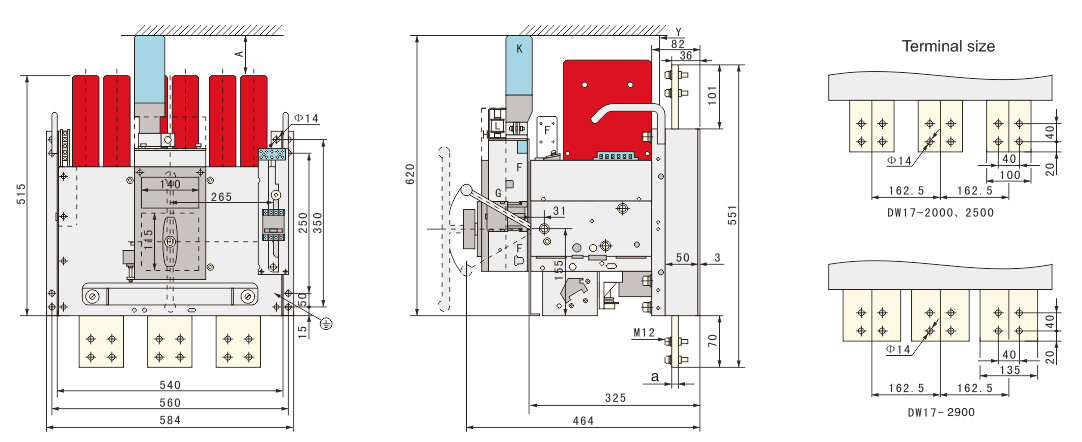 3. Outline and installation dimension of DW17-2000, 2500, 2900 3P fixed low voltage air circuit breaker are shown in Figure 3, 4